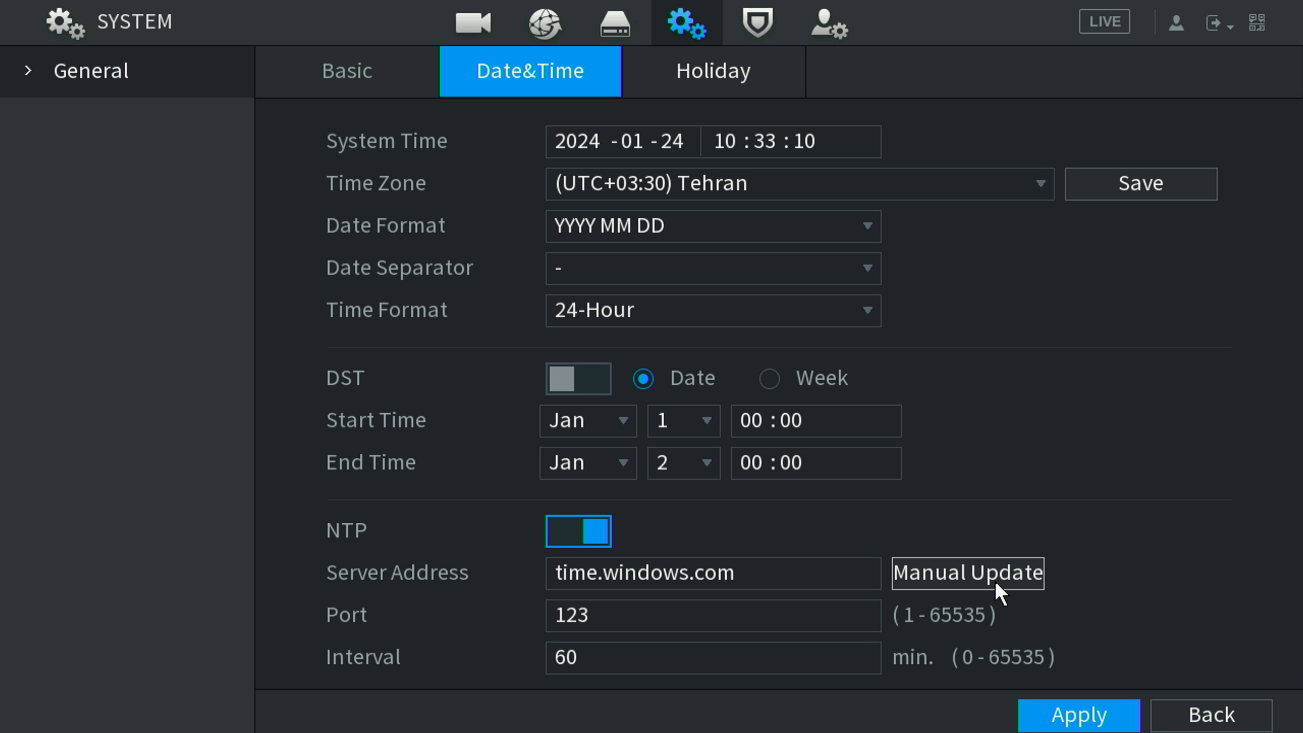 وارد سربرگ date&time میشویم …. از قسمت system time ساعت و تاریخ را تنظیم میکنیم ……….. از بخش time zone منطقه زمانی را انتخاب کرده …………… با فعالسازی قسمت NTP در هر زمانی که دستگاه به اینترنت متصل باشد و با زدن دکمه Manual Udate ساعت دستگاه بصورت خودکار تنظیم میشود